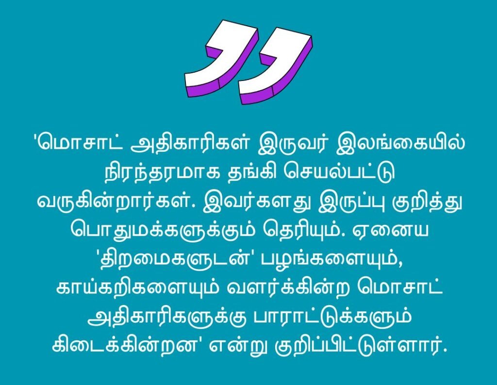 இச்செய்தி அனுப்பப்பட்ட மறுதினம் ‘மொசாட் அதிகாரிகள் இருவர் இலங்கையில் நிரந்தரமாக தங்கி செயல்பட்டு வருகின்றார்கள். இவர்களது இருப்பு குறித்து பொதுமக்களுக்கும் தெரியும். ஏனைய ‘திறமைகளுடன்’ பழங்களையும், காய்கறிகளையும் வளர்க்கின்ற மொசாட் அதிகாரிகளுக்கு பாராட்டுக்களும் கிடைக்கின்றன’ என்று குறிப்பிட்டுள்ளார். இது முன்னரே சொல்லப்பட்டதனை நிரூபிப்பது போன்று ‘விவசாய நிபுணர்கள்’ போர்வையில் இஸ்ரேல் உளவாளிகள் செயற்பட்டதனை உறுதிசெய்கின்றதொரு செய்திக்கூற்றாகும்.