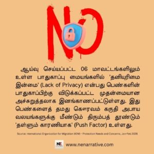 பாதுகாப்பு மையங்களில் நிலவும் உட்கட்டமைப்பு குறைபாடுகள், குறிப்பாகப் பெண்களின் தனிப்பட்ட மறைவுரிமையை (Privacy) உறுதிப்படுத்தத் தவறியமை, அவர்களை மீண்டும் அனர்த்த அபாயம் நிலவும் இடங்களுக்கே தள்ளும் ஒரு மறைமுகக் கருவியாக (Push Factor) மாறியுள்ளது. இது ஒரு ஆபத்தான போக்காகும். பாதுகாப்பு மையங்கள் என்பது மக்களைப் பாதுகாக்கும் இடங்களாக இருக்க வேண்டுமே தவிர, அவர்களின் கண்ணியத்தை இழக்கச் செய்து அவர்களை மீண்டும் அபாயத்திற்குள் தள்ளும் இடங்களாக இருக்கக்கூடாது. International Organization for Migration (IOM) – Protection Needs and Concerns (Jan-Feb 2026) மற்றும் WFP Sri Lanka Country Brief (February 2026) ஆகிய அறிக்கைகள் சுட்டிக்காட்டுவது போல, உட்கட்டமைப்பு ரீதியான பலவீனங்கள் சமூகப் பாதுகாப்பற்ற தன்மையை உருவாக்கி, பெண்களைப் பாலின ரீதியான வன்முறை இடர்களுக்குள் (Gendered Risks) ஆக்குகின்றன.