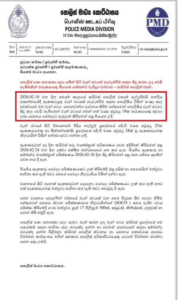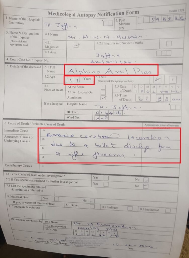பெப்ரவரி 10 ஆம் திகதி பொலிஸார் வாகனத்தை நோக்கி நடத்திய துப்பாக்கிச் சூட்டில் வேனில் பயணித்த 19 வயது இளைஞர் வைத்தியசாலையில் அனுமதிக்கப்பட்ட பின்னர் உயிரிழந்ததாக பொலிஸ் ஊடகப் பிரிவு பெப்ரவரி 11ஆம் திகதி காலை 4 மணிக்கு வெளியிட்ட ஊடக அறிக்கையில் தெரிவிக்கப்பட்டிருந்தது. (படம் 01) “2026.02.10 அன்று அதிகாலை ஊர்காவற்றுறை பொலிஸ் பிரிவுக்குட்பட்ட அல்லைப்பிட்டி சந்திக்கு அருகில் சந்தேகத்துக்கிடமான வேன் ஒன்றை நிறுத்துமாறு பொலிசார் சமிக்ஞை காட்டியபோது, அந்த வேன் நிறுத்தப்படாமல் சென்றதால் பொலிசார் நடத்திய துப்பாக்கிச் சூட்டில் குறித்த வேனில் பயணித்த 19 வயதுடைய இளைஞர் காயமடைந்து யாழ்ப்பாண வைத்தியசாலையில் அனுமதிக்கப்பட்ட பின்னர் உயிரிழந்தார்.” என பொலிஸ் ஊடகப்பிரிவு குறிப்பிட்டிருந்தது. எனினும், உயிரிழந்த சித்தங்கேணியைச் சேர்ந்த அல்பினோ அயூப்ராஜ் அருள் பயாஸ், பிறப்புச் சான்றிதழ் (படம் 03) மற்றும் பிரேத பரிசோதனை அறிக்கைக்கு அமைய, அவர் நவம்பர் 9, 2008 அன்று பிறந்துள்ளார் என்பது உறுதியானது. இதற்கமைய பொலிஸார் உயிரிழந்தவர் ஒரு இளைஞன் காட்ட முயற்சித்துள்ளனர் என்பது அம்பலமானது.